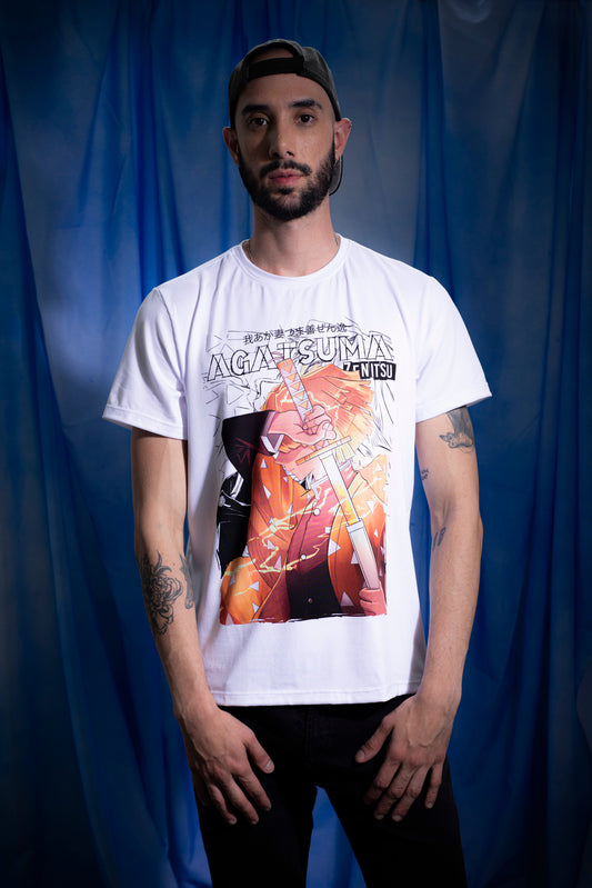 Camiseta Blanca Unisex Zenitsu Desenvaina Demon Slayer