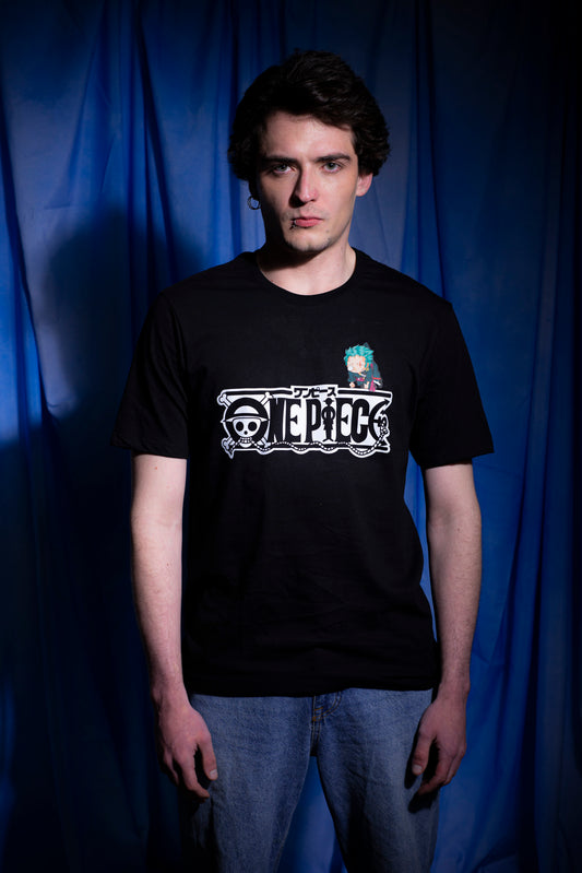 Camiseta Negra Unisex One Piece Logo Zoro Chibi One Piece