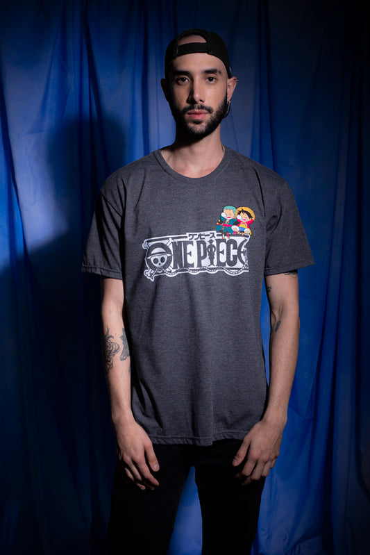 Camiseta Gris Unisex One Piece Logo Luffy y Zoro One Piece